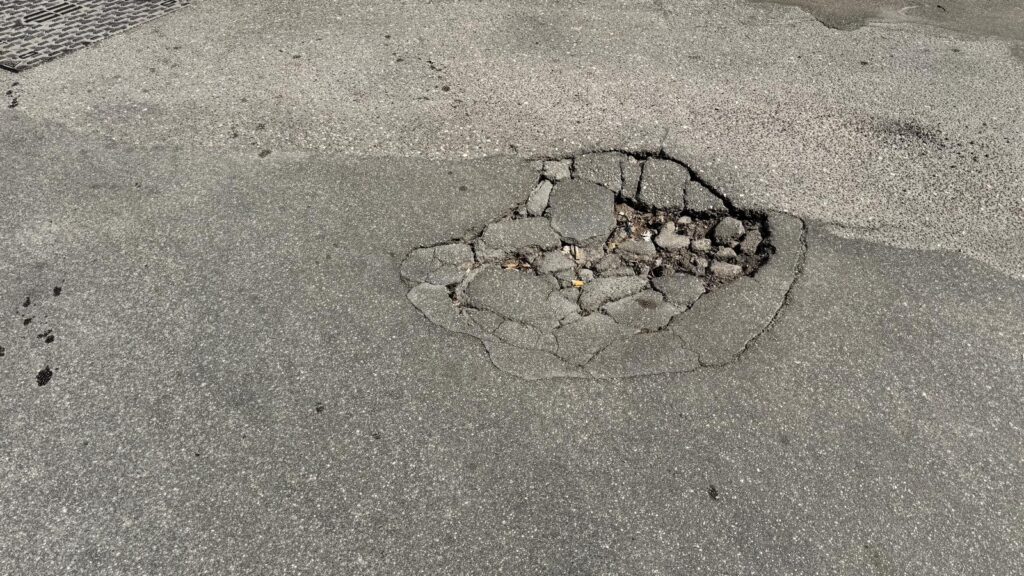 Al centro della carreggiata c’è una buca che sembra dire: “Attenzione, qui si gioca alla roulette russa con le sospensioni”. E il resto del manto stradale non se la passa meglio: sta cedendo come un castello di sabbia bagnata.
